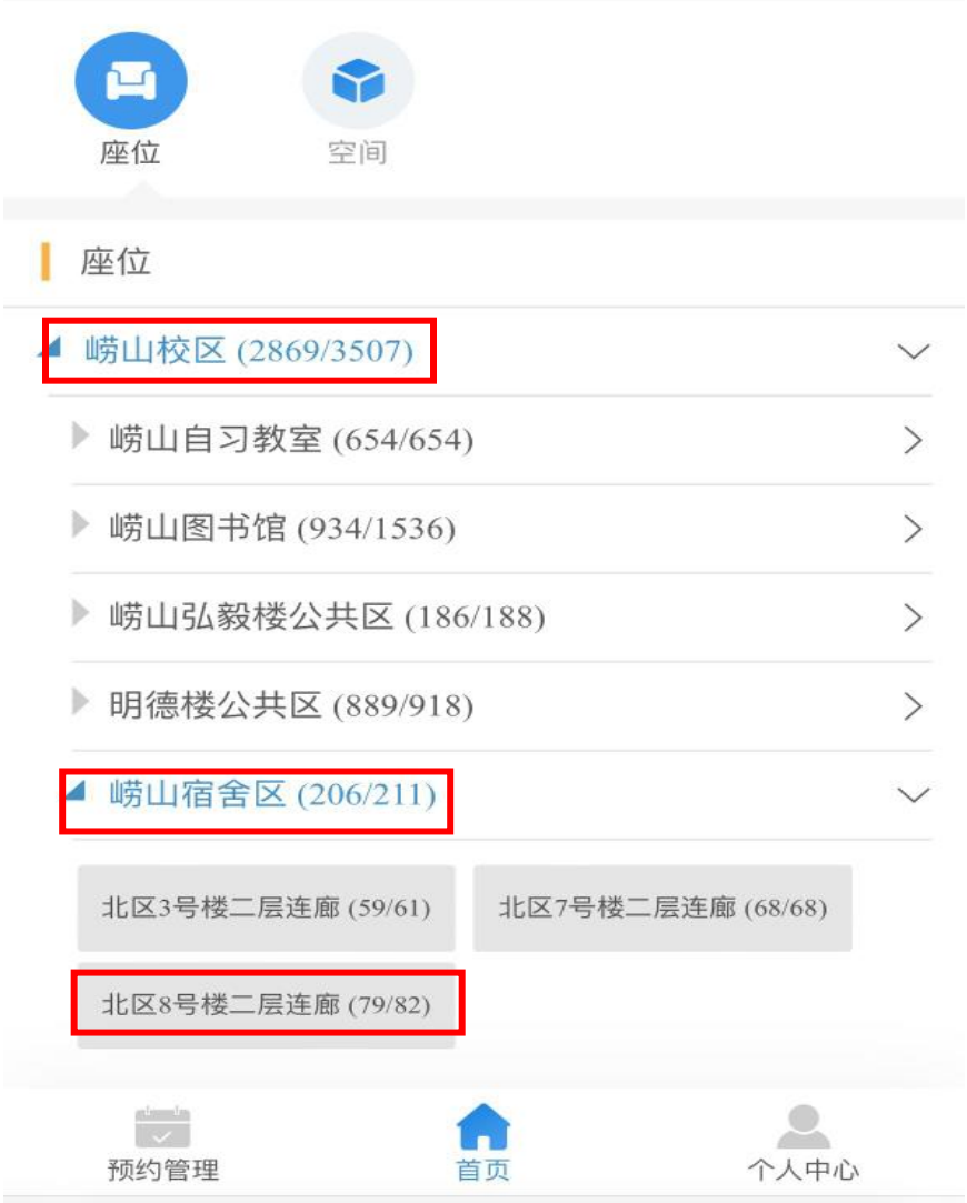 3.进入座位预约界面,选择“崂山校区→崂山宿舍区→北区8号楼二层连廊”。