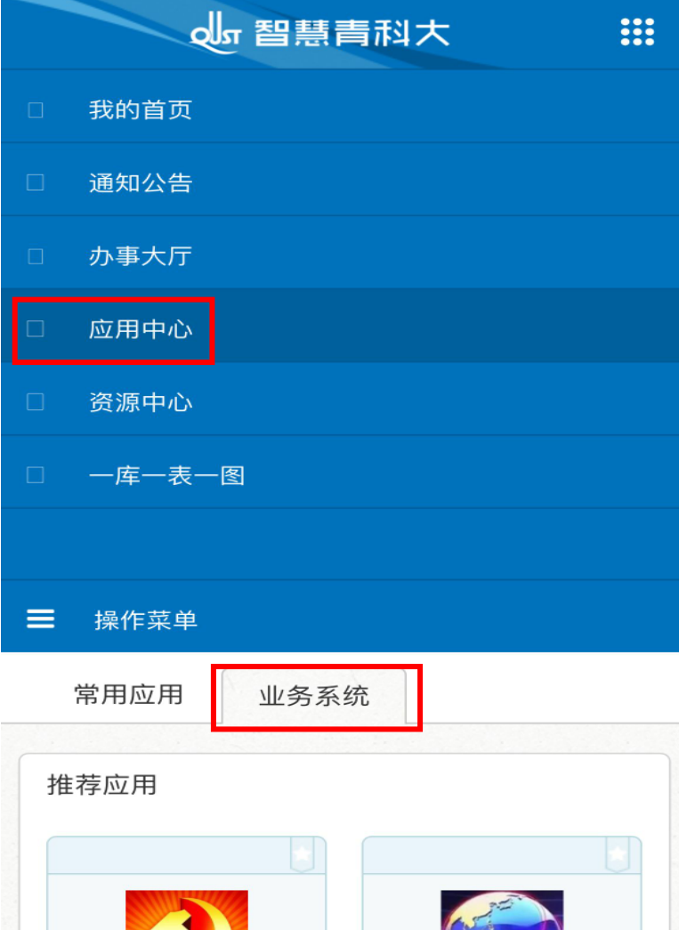 1.登录智慧青科大,在应用中心中找到业务系统界面。